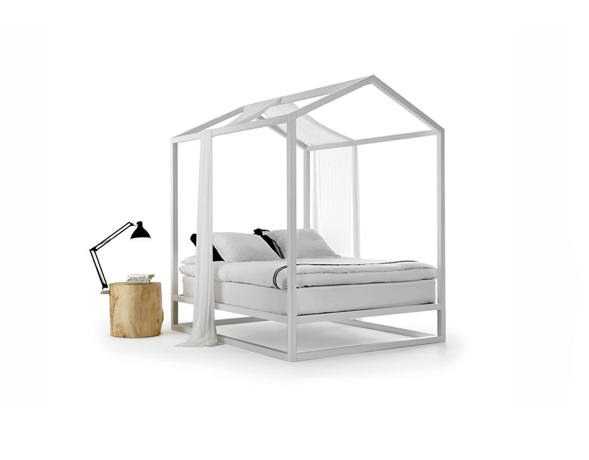 Casetta in Canadà è un letto a baldacchino con struttura in legno massello di frassino laccato bianco. Rievoca nella sua struttura la forma della casetta disegnata dai bambini, come un rifugio dove dormire comodamente. Il protagonista assoluto delle vostre camere da letto.