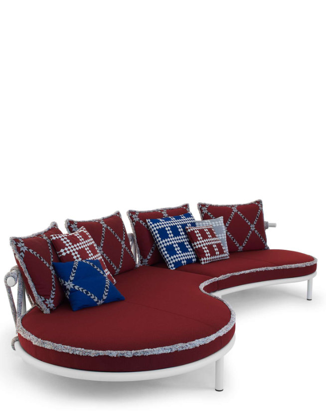 Lo schienale è caratterizzato dall’intreccio realizzato artigianalmente in corda di polipropilene e nylon, mentre i cuscini dello schienale e della seduta sono in fibra riciclata al 100% ottenuta da PET e rivestiti da tela idrorepellente di poliestere. Sono opzionali le frange dei cuscini nella stessa tonalità della corda.