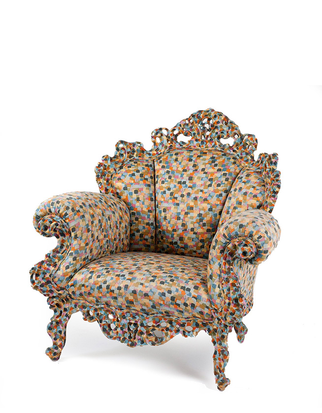 Uno dei più noti pezzi di design al mondo, la poltrona Proust di Alessandro Mendini esordisce nel 1978 come arredo del Palazzo dei Diamanti di Ferrara in occasione di una mostra intitolata "Incontri ravvicinati di architettura" e, in breve tempo, la sua anima postmoderna cattura l’attenzione di amatori e addetti ai lavori su scala internazionale. Questa riedizione dell’iconica poltrona presenta la tradizionale struttura in legno intagliato e dipinto a mano, con un rivestimento fisso in tessuto multicolore che riprende il decoro della struttura stessa. La poltrona Proust viene prodotta in due varianti multicolore: azzurro/grigio/giallo e nero/verde/rosso.