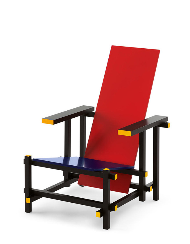 Una sedia-scultura dalla forma pura e razionale. Un autentico manifesto dell’approccio oggettivo del Neoplasticismo, promosso dal movimento olandese De Stijl nel 1917. Una poetica incoraggiata anche da Piet Mondrian, il cui obiettivo era la ricerca della natura essenziale delle cose, l’equivalenza armonica dei colori e l’uso esclusivo dell’angolo retto. Rietveld lavora ai primi prototipi nel 1918, esprimendo la filosofia di organizzazione dello spazio attraverso la monocromia degli elementi. In seguito applica la differenziazione cromatica per separare le parti costruttive in base alle funzioni, arrivando ad accostare la struttura nera alle parti di appoggio colorate. Da qui anche la variazione del nome dell’opera, che da Slat Chair divenne Red and Blue.