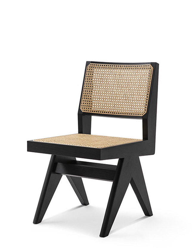 Questa sedia è uno dei modelli più conosciuti tra gli arredi del Capitol Complex di Chandigarh e si trovava in diversi uffici amministrativi del palazzo del Secretariat. E’ costituita da elementi separati tra cui i sostegni laterali posizionati a forma di “V” rovesciata per convergere a sostenere il bracciolo anch’esso in massello. L’impagliatura del sedile e dello schienale all’interno di un telaio in legno sono invece elementi caratteristici dello spirito del luogo, espresso anche nell’uso di legni locali come il teak. In coerenza con la più conosciuta Office Chair, la sedia senza braccioli utilizza anche essa la tipologia a “V” degli appoggi, in tal caso più ridotti poiché non si estendono sino al bracciolo. In essa la priorità è data alla sequenza sedile -schienale in paglia di Vienna, posti in continuità e uniti da due profili in legno dalla massiccia sezione geometrica, elementi che strutturano, con le gambe complanari, un insieme possente e semplice allo stesso tempo. La riedizione Cassina propone oltre alla storica versione in teak, due versioni in rovere naturale e tinto nero.