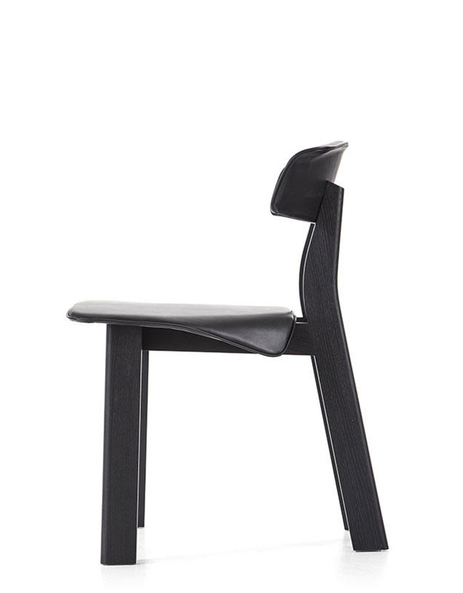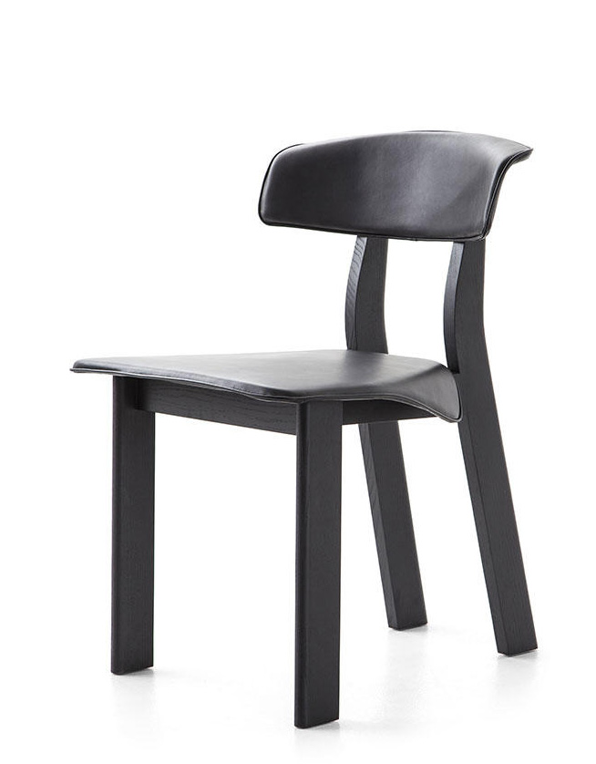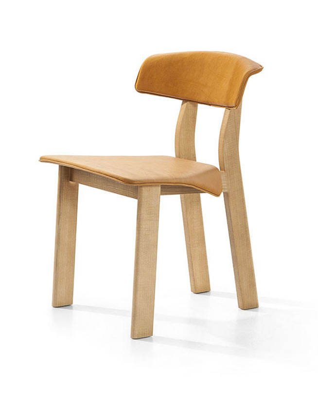La sapienza costruttiva del Meda Made si traduce in una nuova sedia che supera gli stereotipi classici innescando nuovi linguaggi sperimentali di forte identità. La struttura del cavalletto, interamente realizzata in legno massello di frassino, è composta da gambe e traversi con grandi sezioni basiche che esprimono solidità ed energia. L’innovazione formale nasce dal contrasto tra lo spessore marcato della struttura e le superfici esili e sottili del rivestimento, piegato come un foglio per conferire all’oggetto un movimento sorprendente. L’angolazione ergonomica dello schienale e l’imbottitura invisibile accrescono la sensazione di comfort creando un effetto avvolgente in cui la piega superiore funge anche da appoggio per le braccia. L’estetica è esaltata dalle finiture eleganti, dall’assenza di cuciture a vista e dal cordoncino rivestito in pelle che delimita il profilo perimetrale disegnando con precisione la forma della sedia.