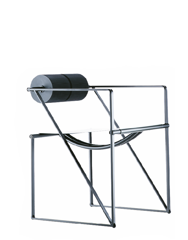 Sedia con braccioli con struttura in acciaio verniciato e seduta in lamiera d'acciaio forata verniciata nero (A009) con schienale costituito da due elementi cilindrici in poliuretano nero.